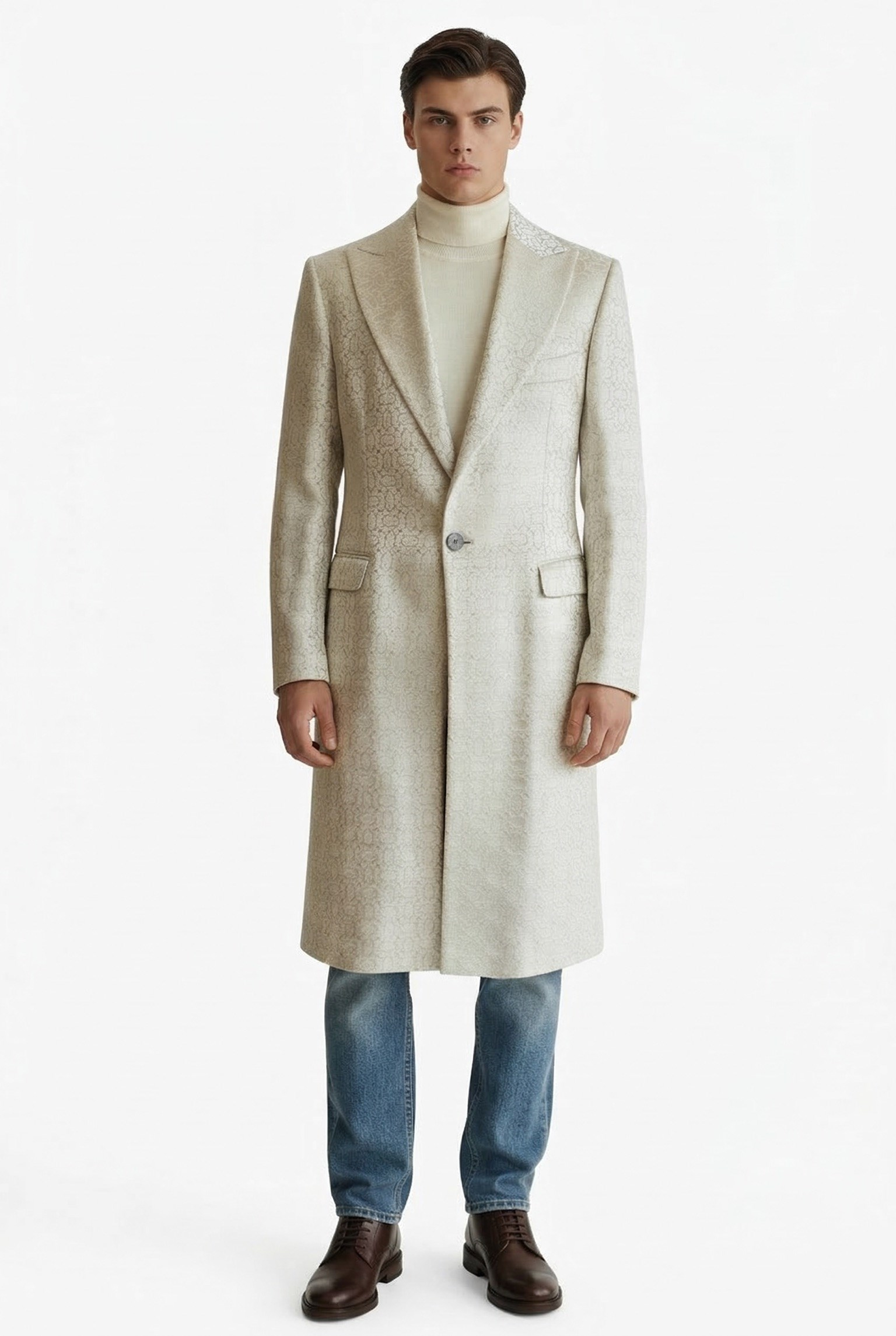 Detaylar: -Uzun Ceket -Limitli Runway / Defile koleksiyonu -Tek Düğme Kapanış, -Modern Slim Fit Kumaş Bilgisi: %55 Cotton, %45 Poly. Yıkama Talimatı: - Makinede yıkanmaz -Ağartıcı kullanılmaz -Kuru temizleme yapılabilir -Tamburlu makinede kurutulmaz - Beden:52, Göbek:50, Kol Boyu:64, Omuz:46, Ceket Boy:120